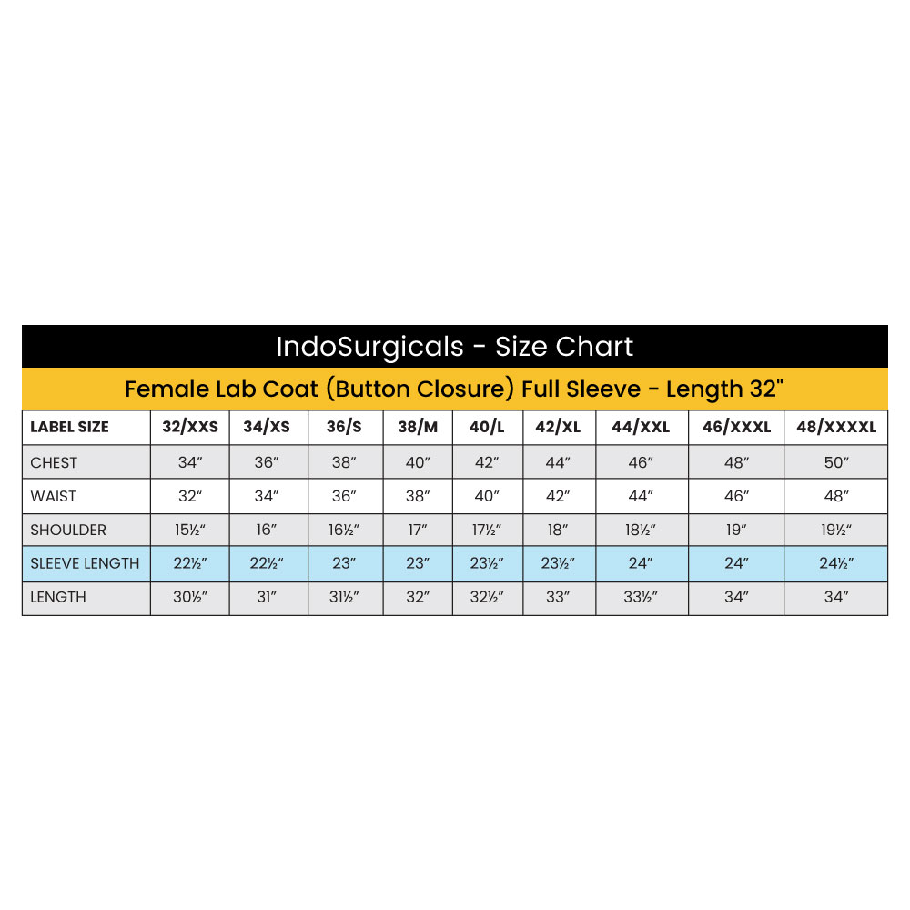 IndoSurgicals Private Limited is one of the largest and most trusted manufacturers, suppliers, and exporters of high-quality female lab coats. Our Female Lab Coat (Button Closure) Full Sleeve - Length 32" is meticulously designed to cater to the diverse needs of professionals across various fields. This lab coat is extensively used in chemistry laboratories, biological laboratories, hospitals, clinics, and medical colleges by doctors, nurses, medical students, lab technicians, pharmacists, researchers, dentists, veterinary professionals, radiologists, pathologists, and other healthcare and science professionals worldwide.