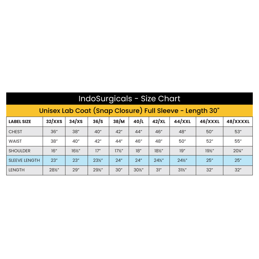 IndoSurgicals Private Limited is one of the largest and most trusted manufacturers, suppliers, and exporters of high-quality Unisex Lab Coats (Snap Closure) Full Sleeve - Length 30". Our lab coats are renowned for their superior craftsmanship and are widely used in chemistry laboratories, biological laboratories, hospitals, clinics, and medical colleges worldwide. They are the preferred choice for doctors, nurses, medical students, lab technicians, pharmacists, researchers, dentists, veterinary professionals, radiologists, and pathologists.