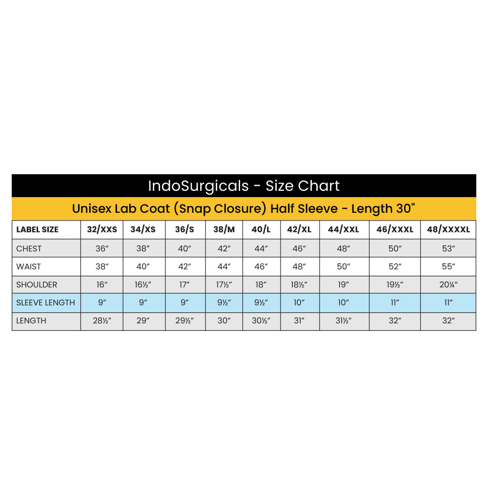 IndoSurgicals Private Limited is one of the largest and most trusted manufacturers, suppliers, and exporters of high-quality Unisex Lab Coats (Snap Closure) Half Sleeve - Length 30". Our lab coats are renowned for their superior craftsmanship and are widely used in chemistry laboratories, biological laboratories, hospitals, clinics, and medical colleges worldwide. They are the preferred choice for doctors, nurses, medical students, lab technicians, pharmacists, researchers, dentists, veterinary professionals, radiologists, and pathologists.