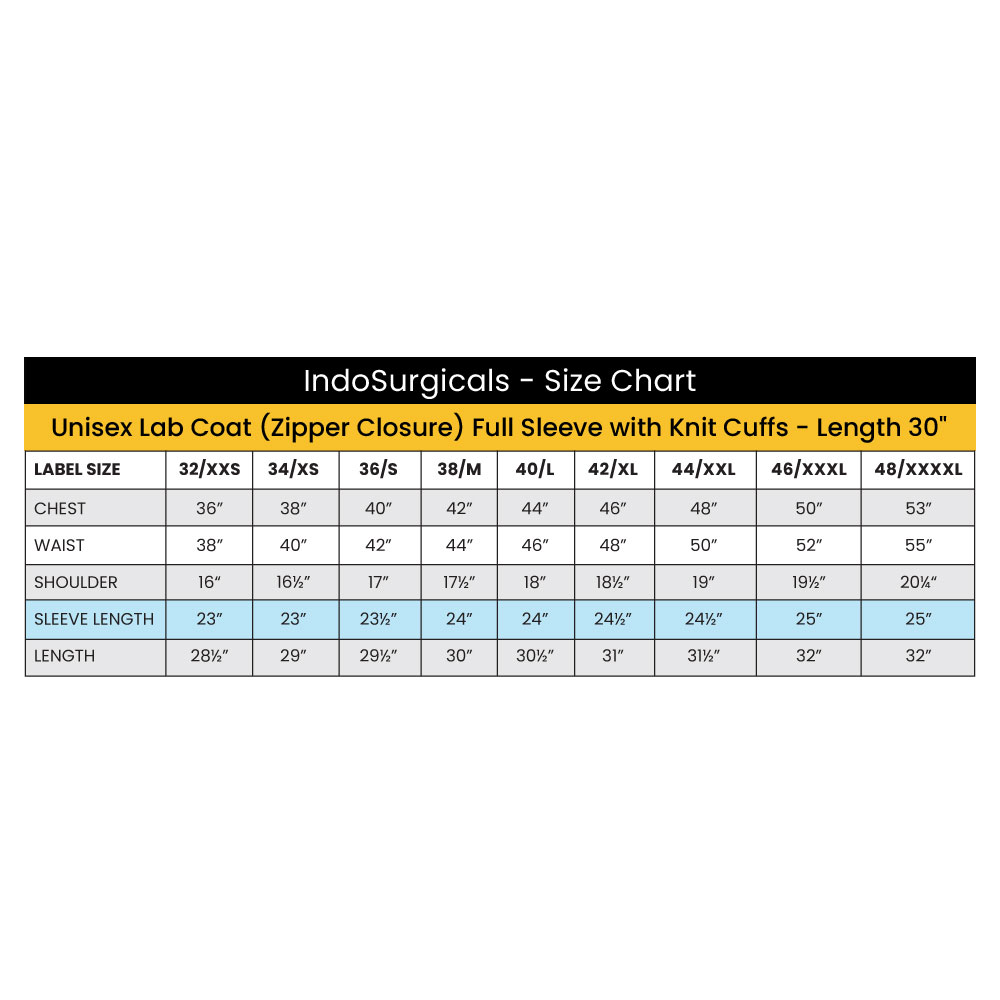 IndoSurgicals Private Limited is one of the largest and most trusted manufacturers, suppliers, and exporters of high-quality Unisex Lab Coats (Zipper Closure) Full Sleeve with Knit Cuffs - Length 30". Our lab coats are renowned for their superior craftsmanship and are widely used in chemistry laboratories, biological laboratories, hospitals, clinics, and medical colleges worldwide. They are the preferred choice for doctors, nurses, medical students, lab technicians, pharmacists, researchers, dentists, veterinary professionals, radiologists, and pathologists.