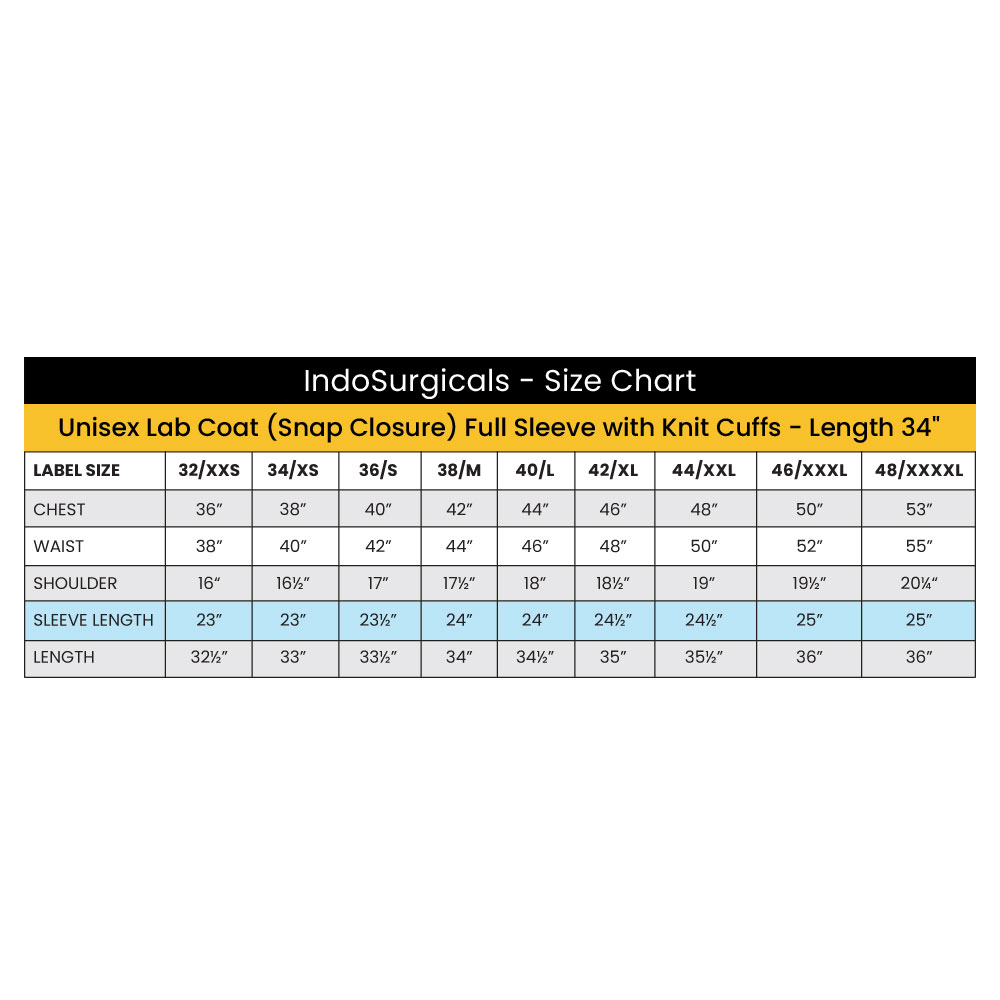IndoSurgicals Private Limited is one of the largest and most trusted manufacturers, suppliers, and exporters of high-quality Unisex Lab Coats (Snap Closure) Full Sleeve with Knit Cuffs - Length 34". Our lab coats are renowned for their superior craftsmanship and are widely used in chemistry laboratories, biological laboratories, hospitals, clinics, and medical colleges worldwide. They are the preferred choice for doctors, nurses, medical students, lab technicians, pharmacists, researchers, dentists, veterinary professionals, radiologists, and pathologists.