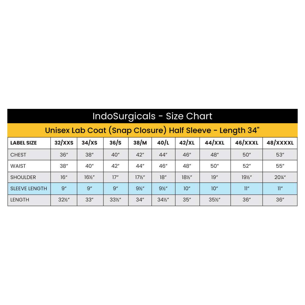 IndoSurgicals Private Limited is one of the largest and most trusted manufacturers, suppliers, and exporters of high-quality Unisex Lab Coats (Snap Closure) Half Sleeve - Length 34". Our lab coats are renowned for their superior craftsmanship and are widely used in chemistry laboratories, biological laboratories, hospitals, clinics, and medical colleges worldwide. They are the preferred choice for doctors, nurses, medical students, lab technicians, pharmacists, researchers, dentists, veterinary professionals, radiologists, and pathologists.