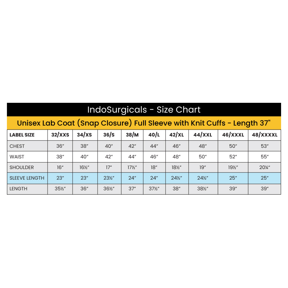 IndoSurgicals Private Limited is one of the largest and most trusted manufacturers, suppliers, and exporters of high-quality Unisex Lab Coats (Snap Closure) Full Sleeve with Knit Cuffs - Length 37". Our lab coats are renowned for their superior craftsmanship and are widely used in chemistry laboratories, biological laboratories, hospitals, clinics, and medical colleges worldwide. They are the preferred choice for doctors, nurses, medical students, lab technicians, pharmacists, researchers, dentists, veterinary professionals, radiologists, and pathologists.